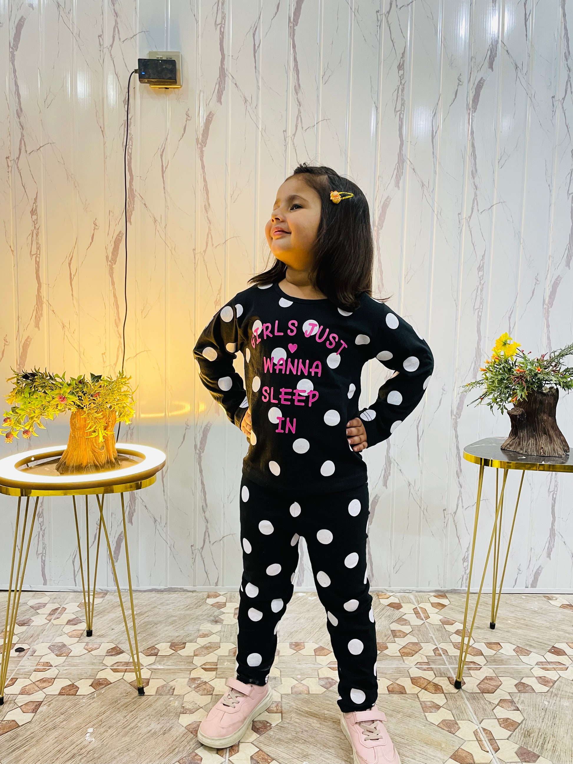 Black Polka Dot wanna sleep Printed Kids Night Suit(ZA-244)
