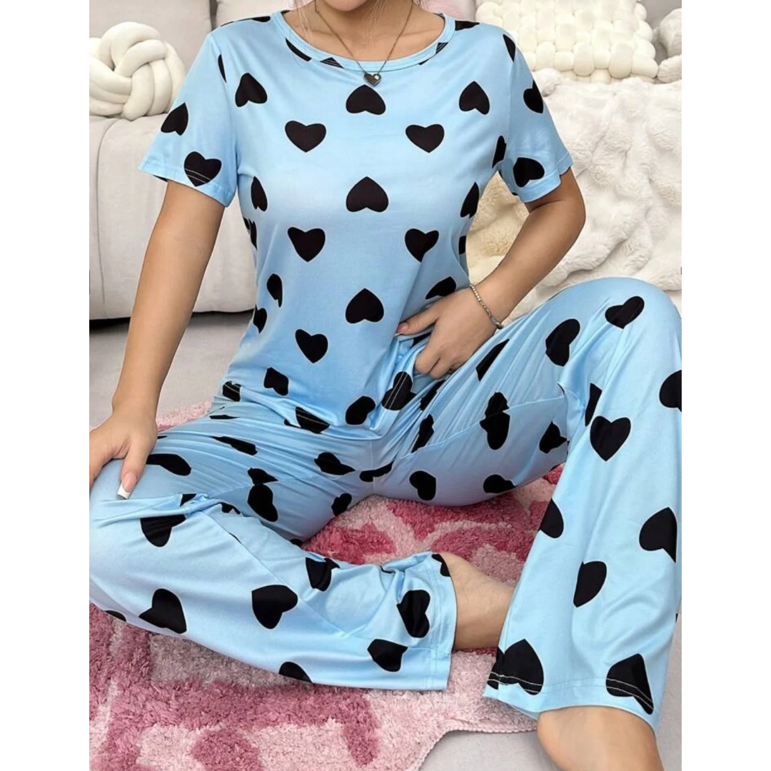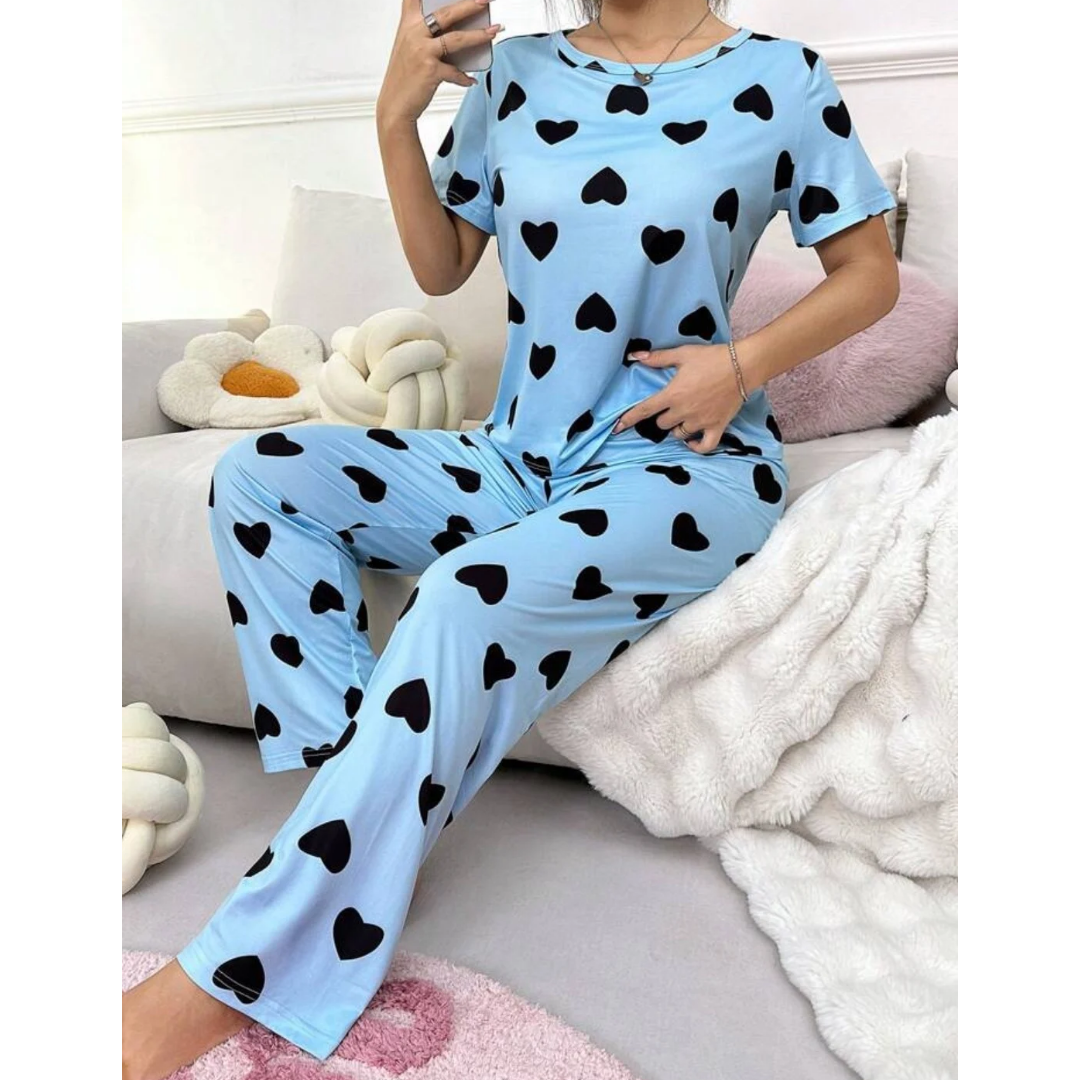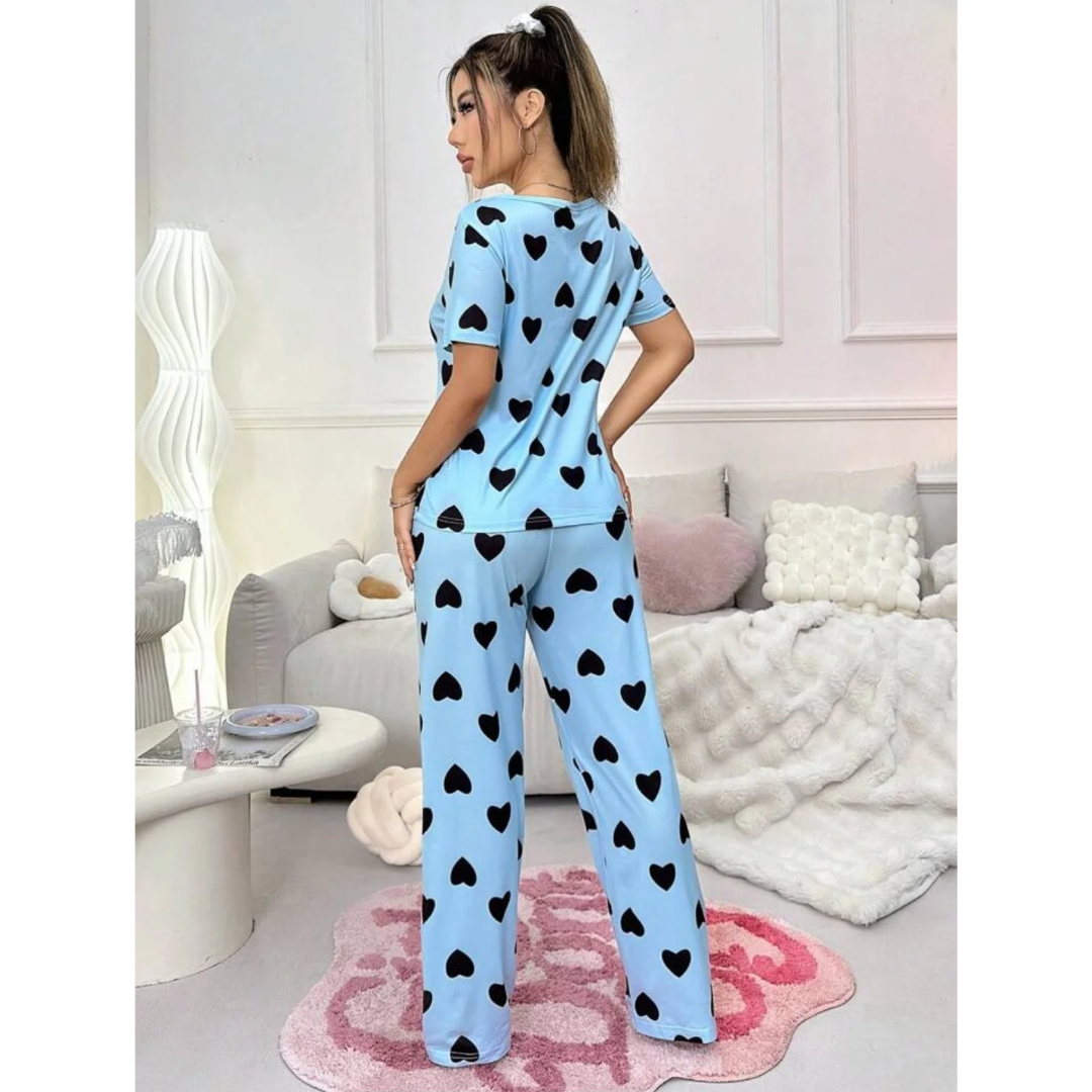 - Product Name : Blue With Black Hearts Print Half Sleeves T-shirt With Hearts Printed Trouser Suit (RX-188)