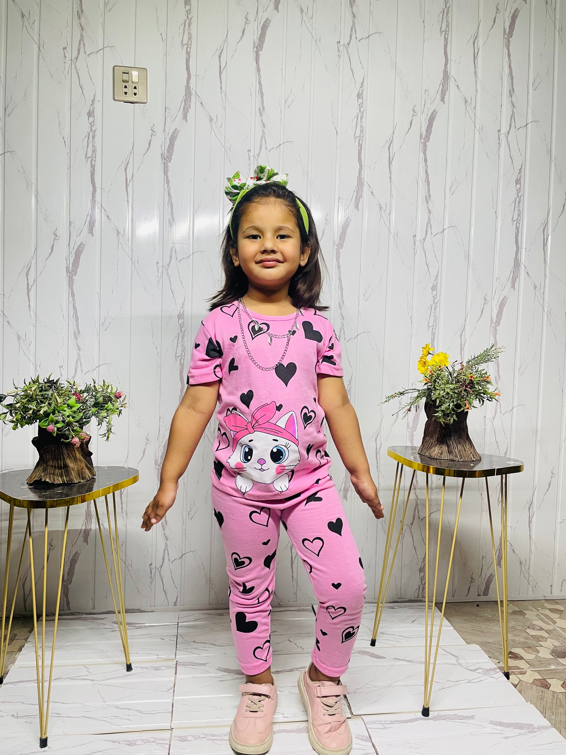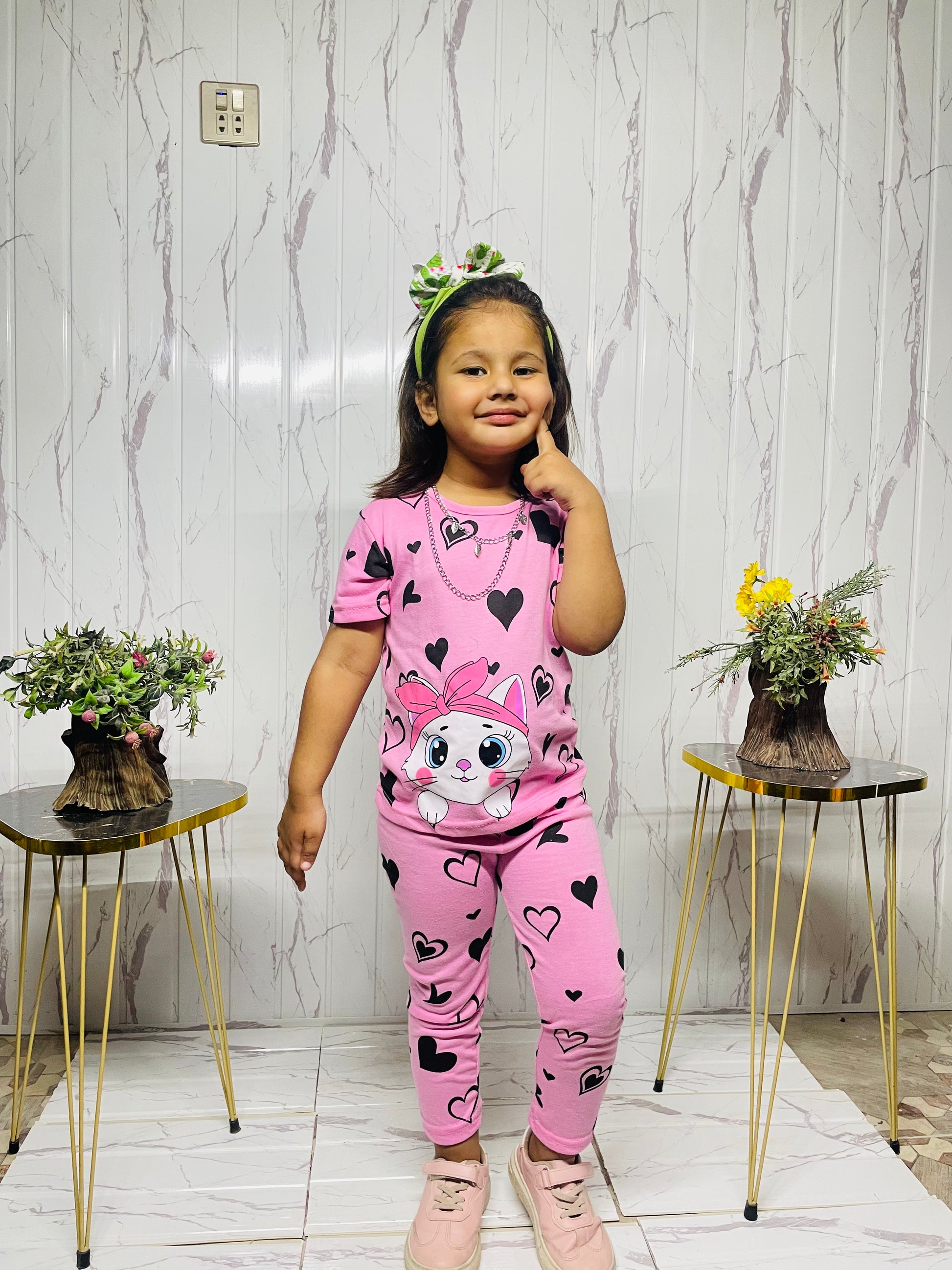 - Product Name : Pink Kitty with black hearts Printed Kids Suit (ZA-256)